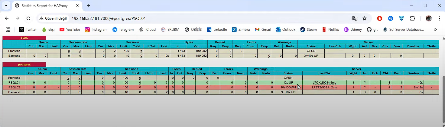 HAProxy config tamamlandıktan sonra http://192.168.52.181:7000 url’inden haproxy status sayfasını ziyaret edelim ve clusterı görüntüleyelim.